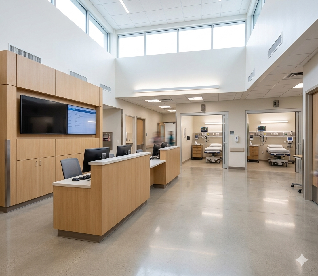 Renovation of a busy emergency department improving patient flow, staff efficiency, and safety protocols. Project phased to maintain emergency services during construction.